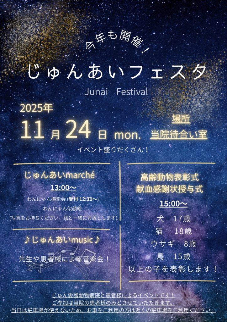 昨年同様、高齢動物の表彰式(犬17歳~、猫18歳~、うさぎ8歳~、鳥15歳〜)、献血感謝状授与式、プロのカメラマンによる愛犬愛猫の撮影会、先生や患者様による音楽やダンスなど!!